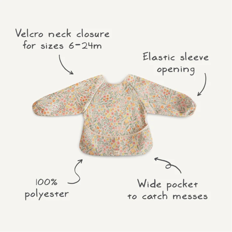 Babete de manga comprida com padrão floral Pastel Blooms, ideal para proteção total durante refeições. Material resistente à água, bolso largo e fecho de velcro. Para bebés dos 6-24 meses.