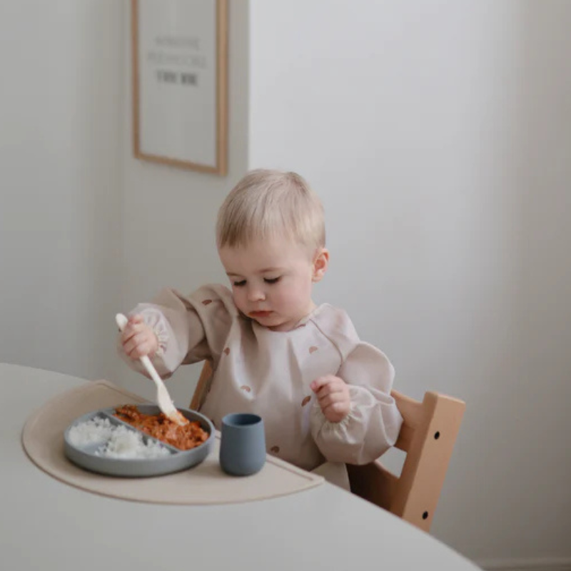 Mushie Babete Silicone é uma babete feita de silicone alimentar, indicada para bebés a partir dos 6 meses. Apresenta fechos arredondados para um ajuste confortável e um bolso frontal perfeito para apanhar comida.
