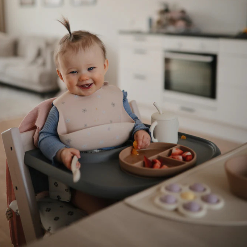 Mushie Babete Silicone é uma babete feita de silicone alimentar com adoráveis desenhos, apresenta fechos arredondados para um ajuste confortável e um bolso frontal perfeito para apanhar comida.