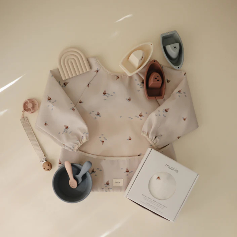 Mergulha numa aventura marinha a cada refeição! A Babete de Manga Comprida da Mushie com o encantador padrão Boats transforma a proteção numa experiência divertida.