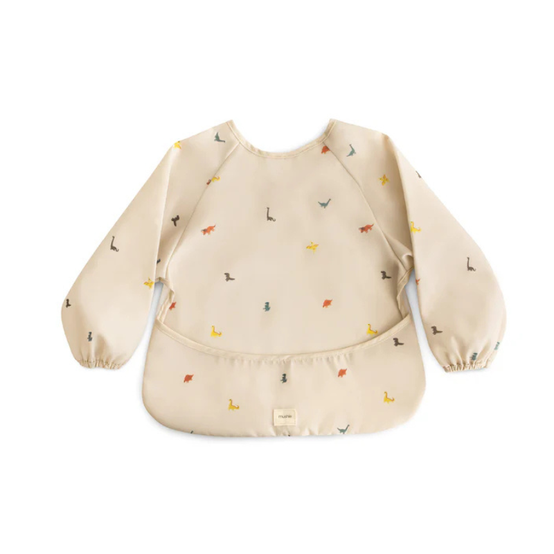 Babete impermeável com mangas e estampado de dinossauro, ideal para proteger a roupa do bebé durante refeições ou brincadeiras. Feita com poliéster reciclado e bolso frontal apanha-migalhas.