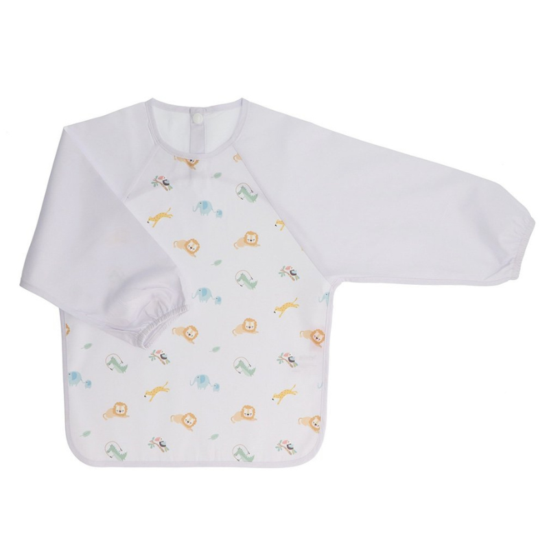 Babete de manga comprida Miniland Jungle em PU impermeável. Protege a roupa da criança em refeições e atividades. Com bolso para migalhas, fecho ajustável e etiqueta personalizável. Lavável na máquina. Design divertido de animais da selva.