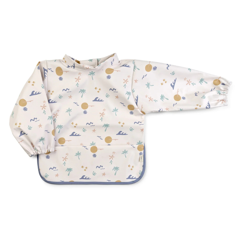 Babete de proteção total com mangas compridas, ideal para bebés dos 6 aos 24 meses. Feito em material resistente à água, com bolso largo para recolher alimentos e fecho de velcro. Fácil de limpar e lavável na máquina.