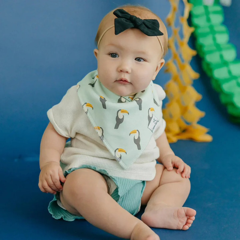 O trio de bandanas mais estiloso e prático para o teu bebé! 100% algodão absorvente na frente e fleece de poliéster super macio atrás, mantêm o pescoço do bebé sempre seco. Ajustáveis com fechos sem níquel para dos 0 aos 36 meses. Laváveis na máquina. O acessório perfeito para driblar a baba e os dentes a nascer, com muito estilo! Pack com 4 bandanas.