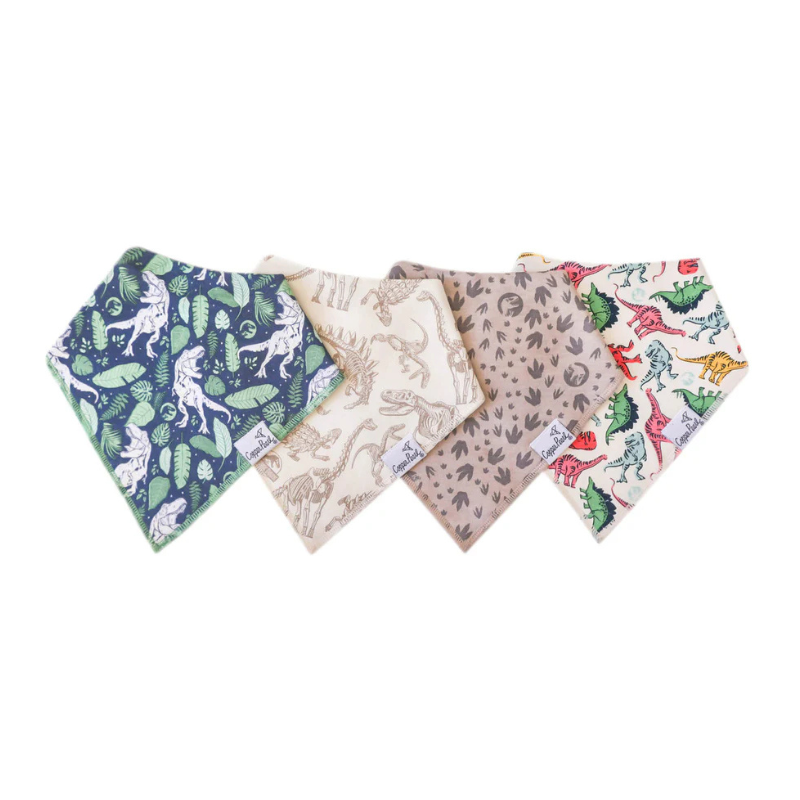 O trio de bandanas mais estiloso e prático para o teu bebé! 100% algodão absorvente na frente e fleece de poliéster super macio atrás, mantêm o pescoço do bebé sempre seco. Ajustáveis com fechos sem níquel para dos 0 aos 36 meses. Laváveis na máquina. O acessório perfeito para driblar a baba e os dentes a nascer, com muito estilo! Pack com 4 bandanas.