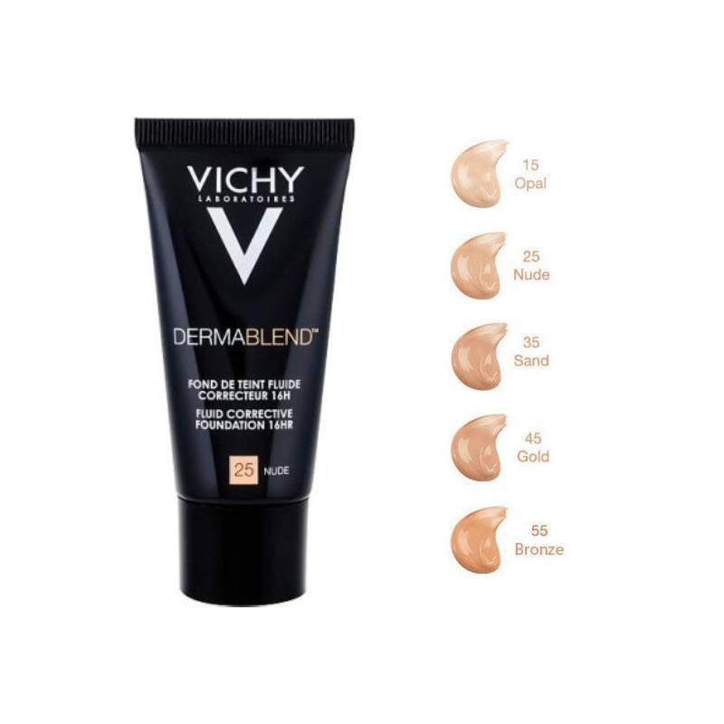 Vichy Dermablend Base Corretora Fluida 16h 25 Nude oferece uma cobertura perfeita durante 16 horas.