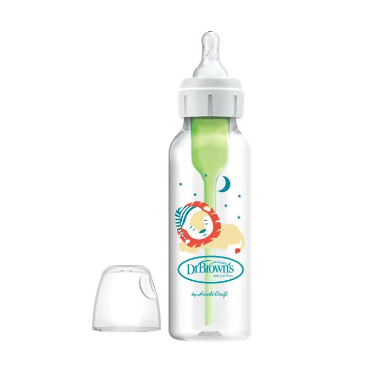 Biberão anticólicas Dr. Brown's Options+ 250ml (boca estreita) com desenho de leão. Sistema de ventilação patenteado reduz cólicas, gases e regurgitações. Preserva vitaminas e minimiza risco de otite. Versátil, seguro e livre de BPA. Desde o nascimento.