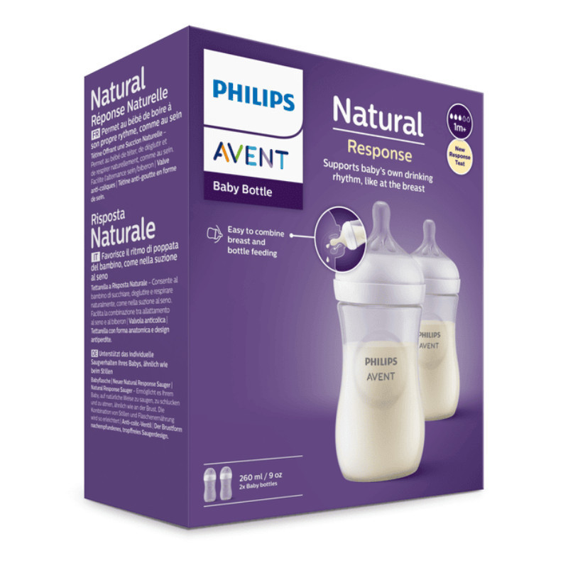 Philips Avent Natural Response Biberão Neutro Duo +1M 2x260ml é composto por 2 biberões de 260 ml. Philips Avent Natural Response Biberão é um biberão com uma tetina natural, indicada para bebés a partir de 1 mês. Permite ao bebé sugar, engolir e respirar ao seu ritmo, como no peito. Possui uma válvula anticólicas e uma tetina com o formato do peito e desenho anti-gotas.