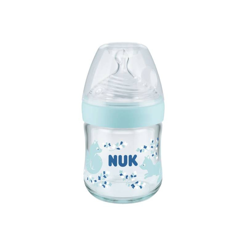 Nuk Nature Sense Biberão Vidro Tetina S 0-6M 150ml com tetina em silicone suave que se adapta de forma especialmente flexível à boca do bebé.