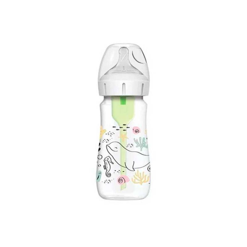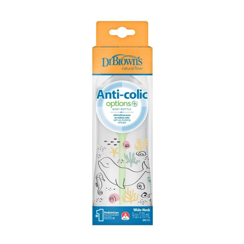 Biberão anticólicas Dr. Brown's Options+ boca larga 270ml (design Oceanos). Sistema de ventilação patenteado reduz cólicas e gases. Tetina de silicone que imita o peito, evitando a confusão de mamilo. Livre de BPA. Desde o nascimento.