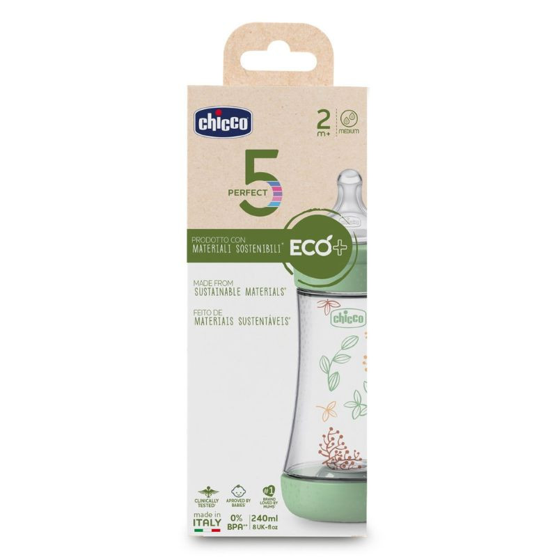 Chicco Biberão Perfect 5 Eco +2M é um biberão com uma tetina fisiológica macia em silicone e fluxo médio, que se adapta na perfeição à boca do bebé, respeitando o movimento natural de sucção.