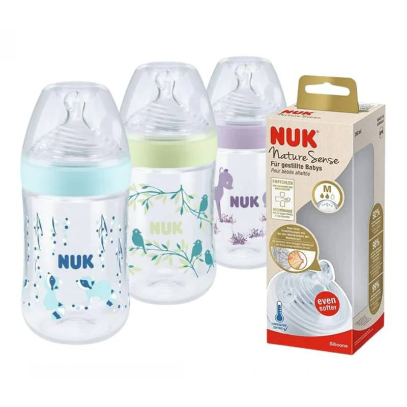 Nuk Nature Sense Biberão Vidro Tetina M 0-6M 240ml de vidro com tetina em silicone suave que se adapta de forma especialmente flexível à boca do bebé.