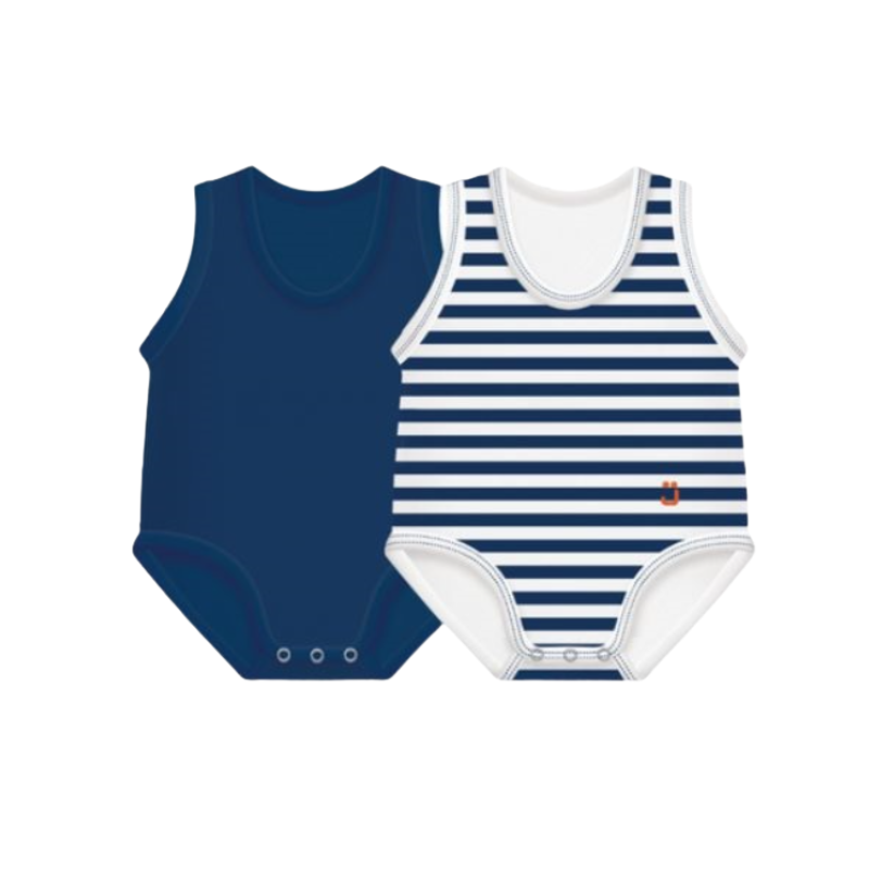 O body essencial de verão para o teu bebé! Em algodão biológico fresco e respirável, perfeito para os dias quentes. O tamanho único ajustável acompanha o crescimento dos 0 aos 36 meses. Pack sustentável com 2 bodies na cor azul escuro. Simples, confortável e prático para a estação mais quente.