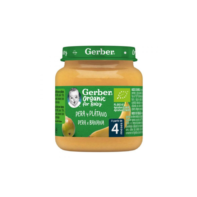 Gerber Organic Boião Pera e Banana é um puré de fruta de primeira qualidade, 100% Biológica, cultivadas e selecionadas especialmente para a alimentação infantil. Indicado para introdução da fruta na alimentação do bebé, a partir dos 4 meses.