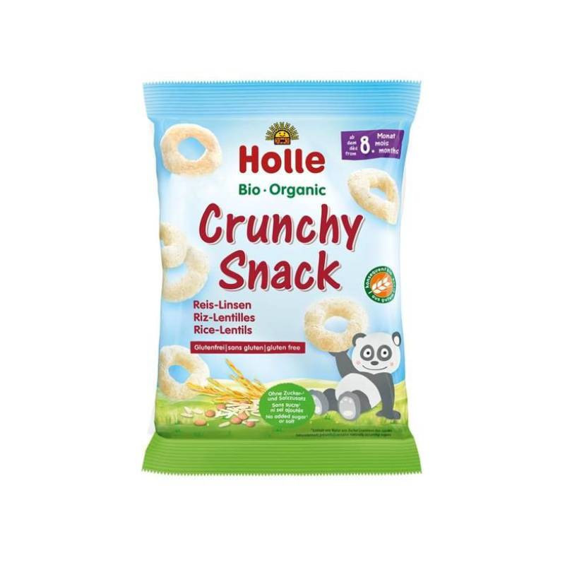 Holle Bio Crunchy Snack Crocante De Arroz E Lentilhas 25g +8M à base cereais e leguminosas tufados, isento de glúten, para bebés a partir dos 8 meses.