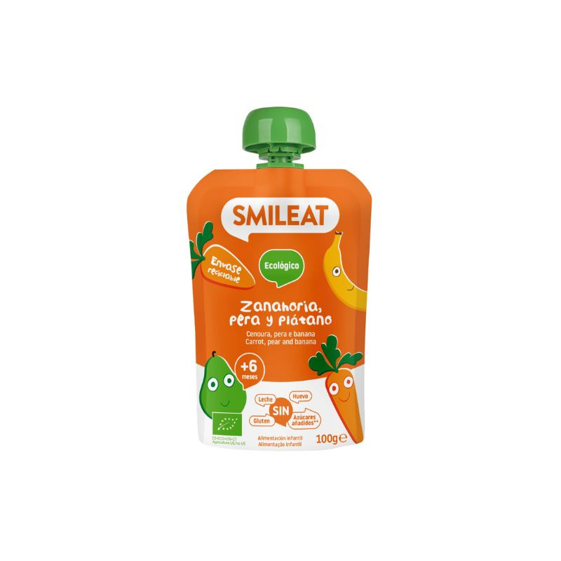 Smileat Bio Saqueta Fruta Cenoura Pera e Banana +6M 100g é um puré de frutas com ingredientes 100% biológicos sem açúcares adicionados, ideal para que o bebé possa tomar sozinho.