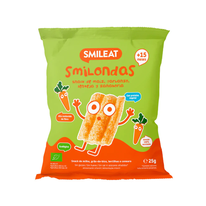 É o snack ideal para bebés a partir dos 15 meses. Com uma mistura nutritiva de milho, grão-de-bico, lentilhas e cenoura, as Smilondas são crocantes, saborosas e perfeitas para o desenvolvimento saudável do teu bebé.