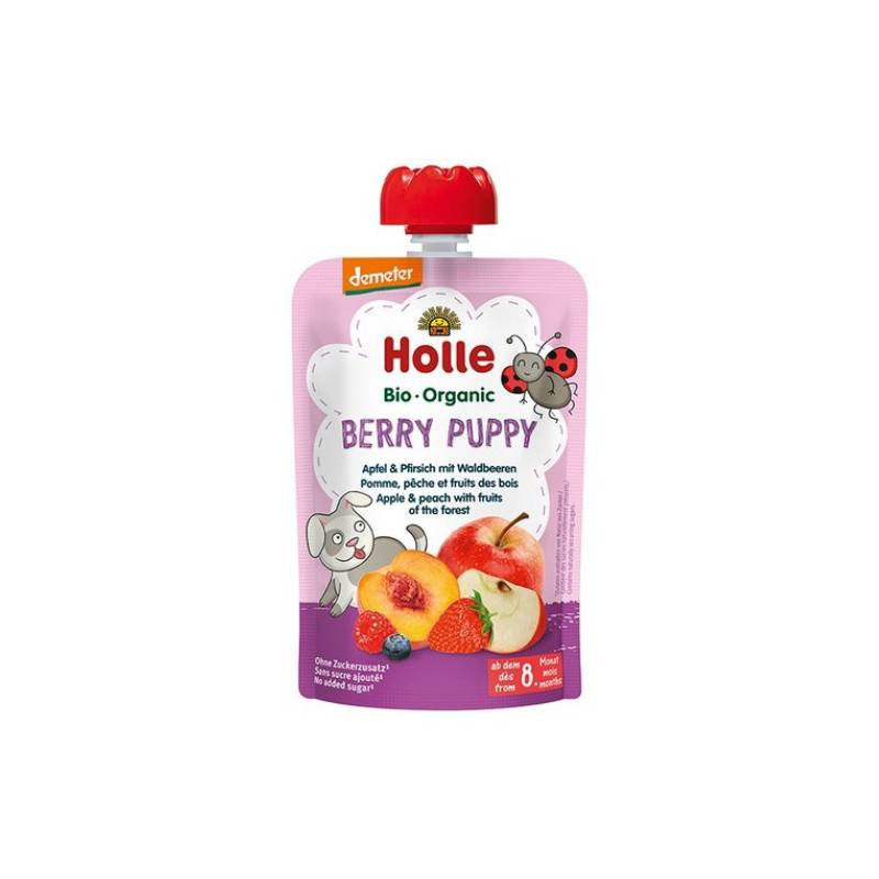 Holle Bio Berry Puppy Puré De Frutos 100g +8M elaborado com ingredientes biológicos - maçã, pêssego, morango, mirtilo e framboesa.