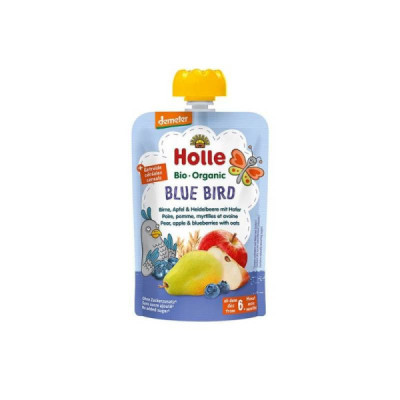 Holle Bio Blue Bird Puré Frutos 100g +6M elaborado com pera, maçã, mirtilo e aveia de agricultura biológica, para bebés a partir dos 6 meses.
