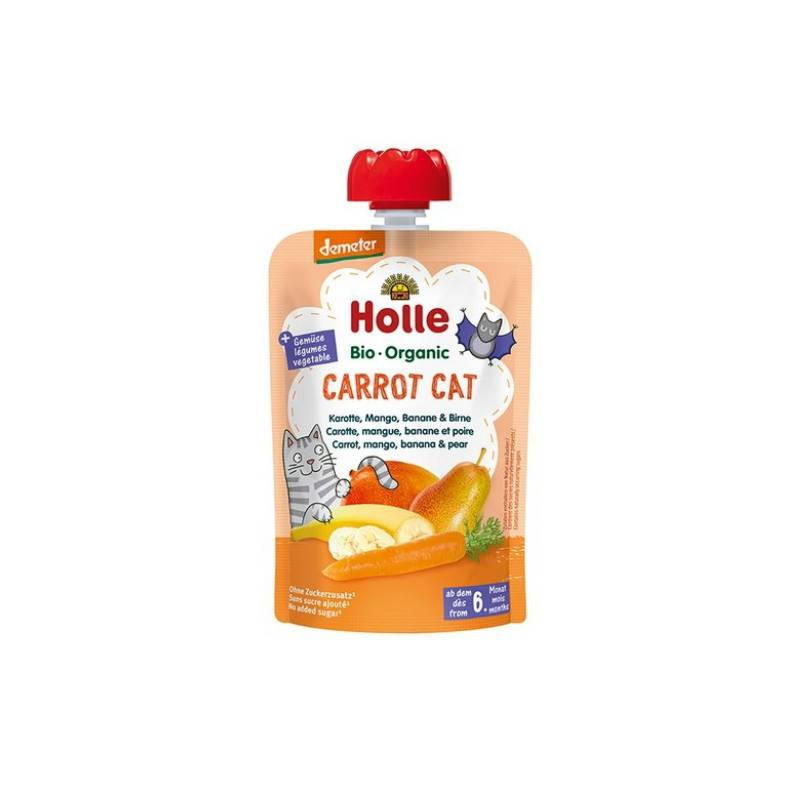 Holle Bio Carrot Cat Puré Frutos 100g +6M elaborado com cenoura, manga, banana e pera, de agricultura biológica.