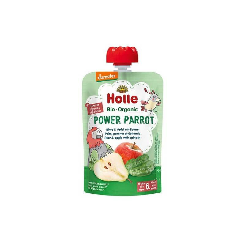 Holle Bio Power Parrot Puré Frutos E Legumes 100g +6M elaborado com pera, maçã e espinafres para bebés a partir dos 6 meses.
