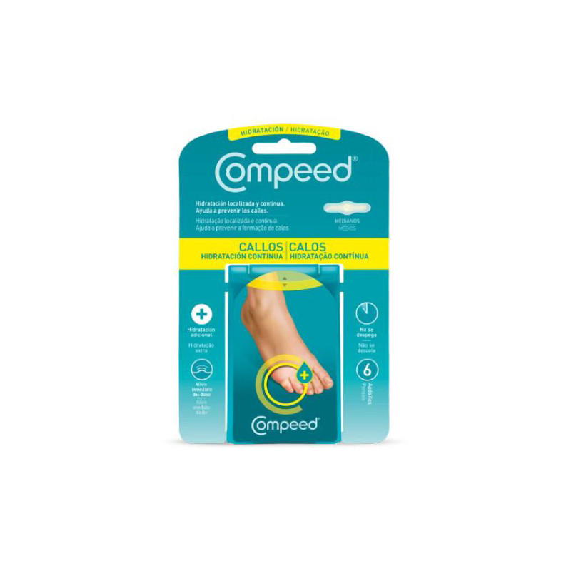 Compeed Pensos Calos Hidratação é um penso que alivia a dor e protege contra a fricção e pressão, indicado na remoção de calos, de forma rápida e natural. A tecnologia hidrocoloide Compeed® ajuda a reduzir a pressão e alivia imediatamente a dor. Melhora também a hidratação da pele, suavizando o calo, facilitando a sua remoção. Material impermeável e respirável. Adapta-se a todos os movimentos e não se descola durante dias. Quantidade: 6 pensos.