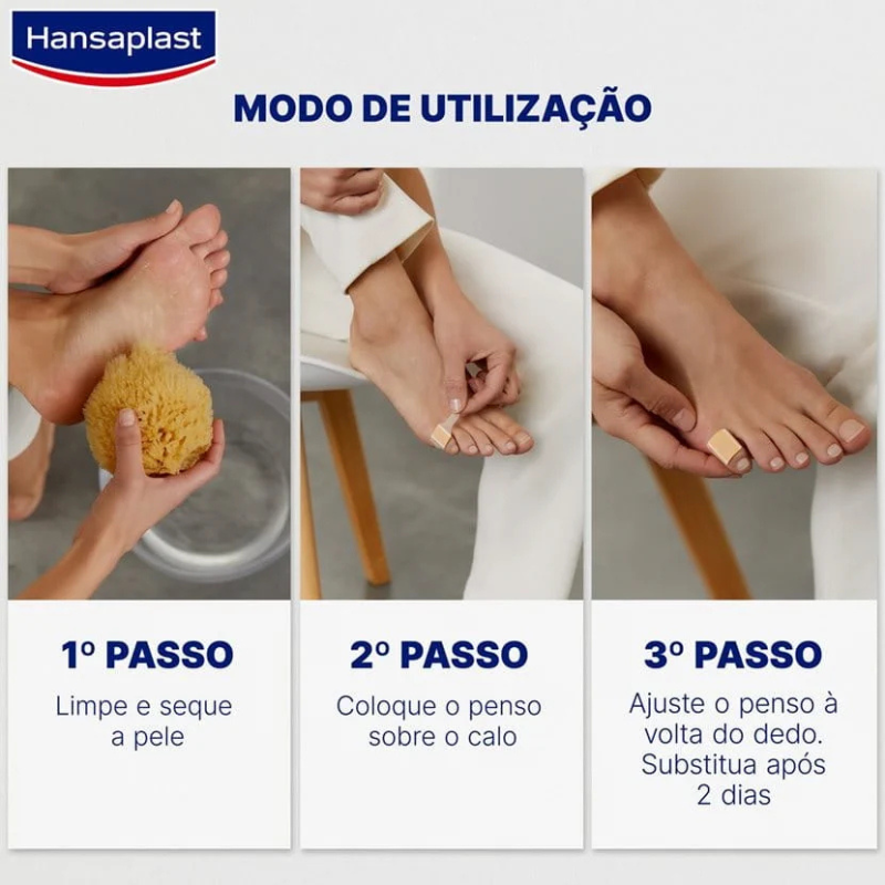 Limpe a ferida e seque cuidadosamente. Aplique o penso, colocando o centro do anel de espuma diretamente sobre o calo. Substitua o penso após 2 dias. Após 4 dias, retire o calo amolecido com sal ou sabão num banho quente. Repita se necessário.