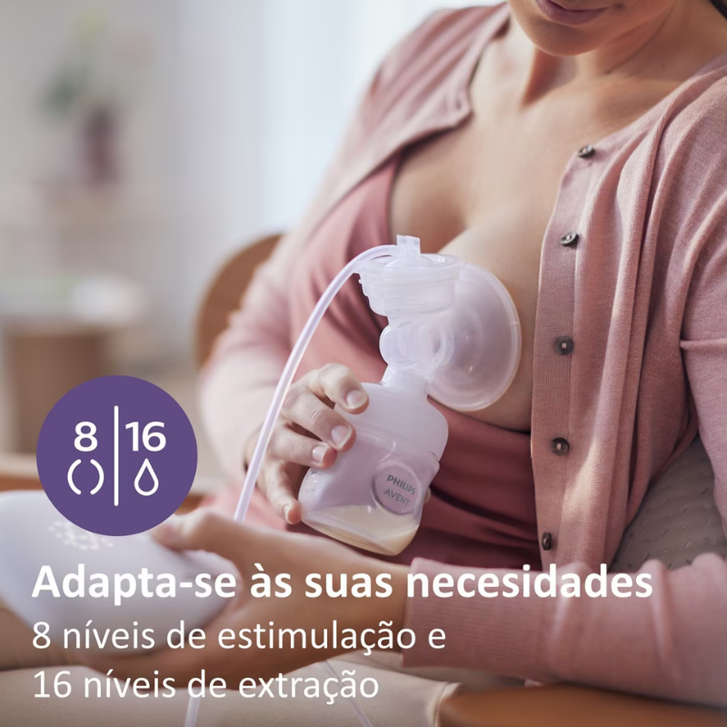A bomba tira-leite elétrica simples mãos livres Philips Avent é silenciosa e oferece extração eficaz e confortável, simulando o ritmo natural do bebé.
