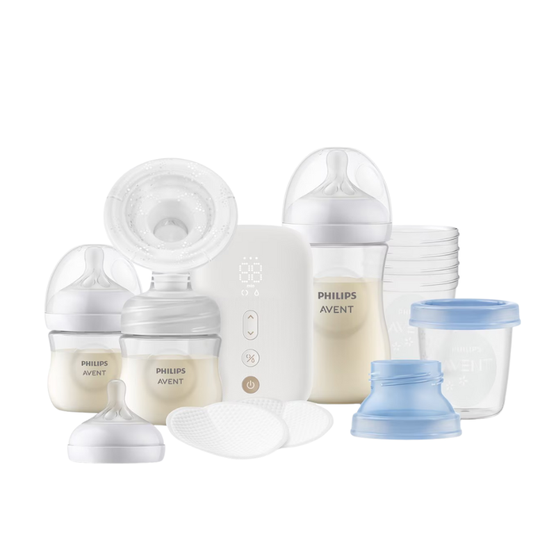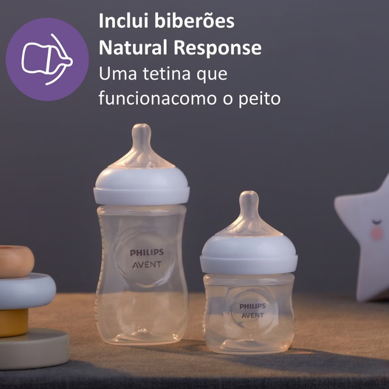 O Conjunto Amamentação Premium Philips Avent inclui uma Bomba Tira-Leite Elétrica Portátil, 2 biberões (1 unidade de 125ml e 1 unidade de 260ml), discos de amamentação descartáveis (24 unidades), 1 tetina de +0 meses, sacos para armazenamento de leite descartáveis (5 unidades), além de copos de armazenamento de leite (5 unidades de 180ml com tampa e 5 unidades de 240ml com tampa).