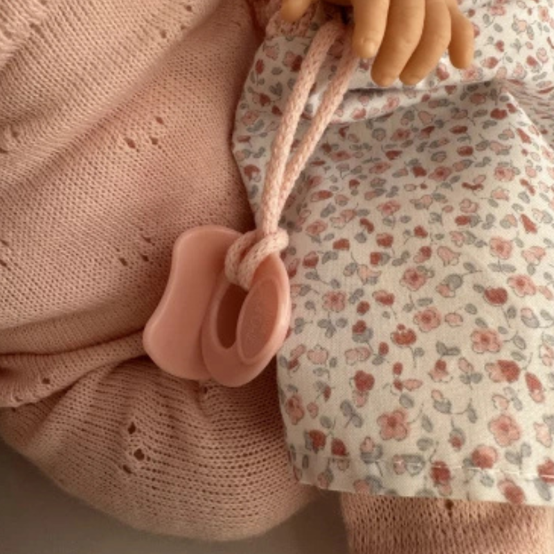 Boneca macia de 18cm com mordedor em coração. Perfeita para abraçar, confortar e aliviar as dores da dentição. Lavável na máquina. Para recém-nascidos e bebés.