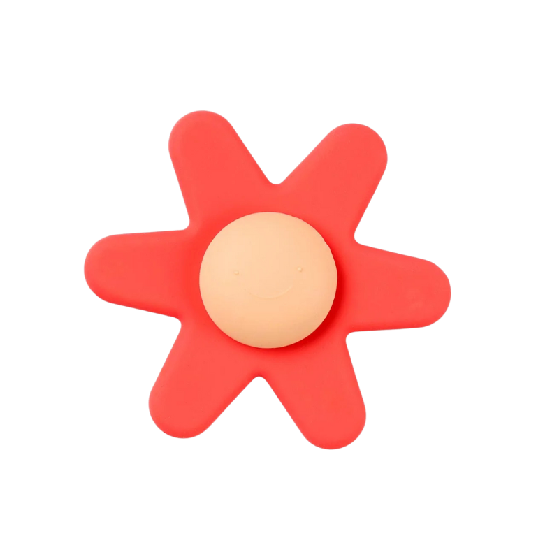 Spinner em forma de flor com ventosa, feito em silicone macio. Ideal para entreter e estimular os sentidos do bebé na mesa, no banho ou em qualquer superfície lisa.