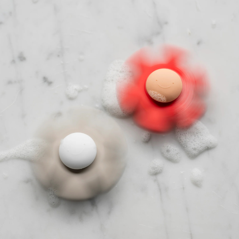 Spinner em forma de flor com ventosa, feito em silicone macio. Ideal para entreter e estimular os sentidos do bebé na mesa, no banho ou em qualquer superfície lisa.
