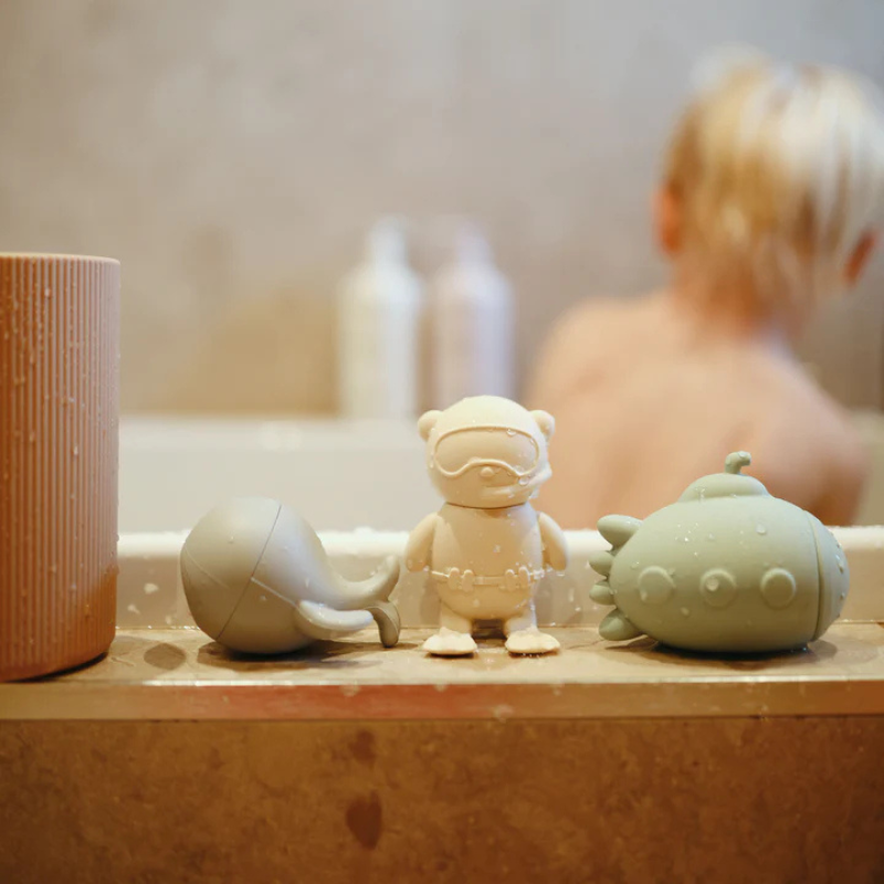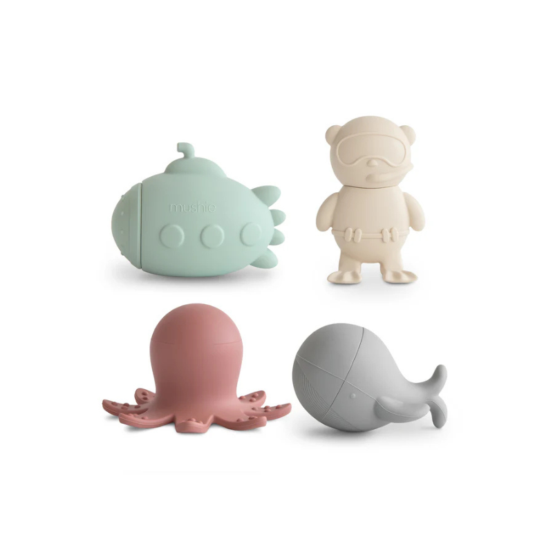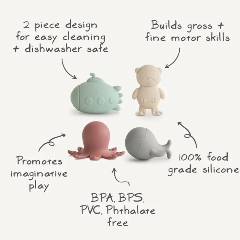 Este conjunto inclui 4 brinquedos de banho temáticos da vida marinha (submarino, baleia, polvo e mergulhador) em silicone alimentar de alta qualidade. São fáceis de agarrar, seguros e concebidos para evitar a formação de bolor. Recomendado para bebés a partir dos 10 meses.