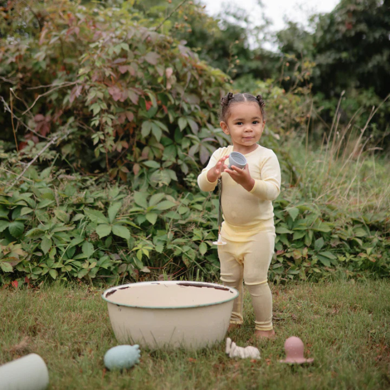 Set de brinquedos de praia Monnëka em tom Sea Green. Inclui balde, pá, ancinho e moldes em silicone macio. Perfeito para brincar na areia com conforto e segurança.