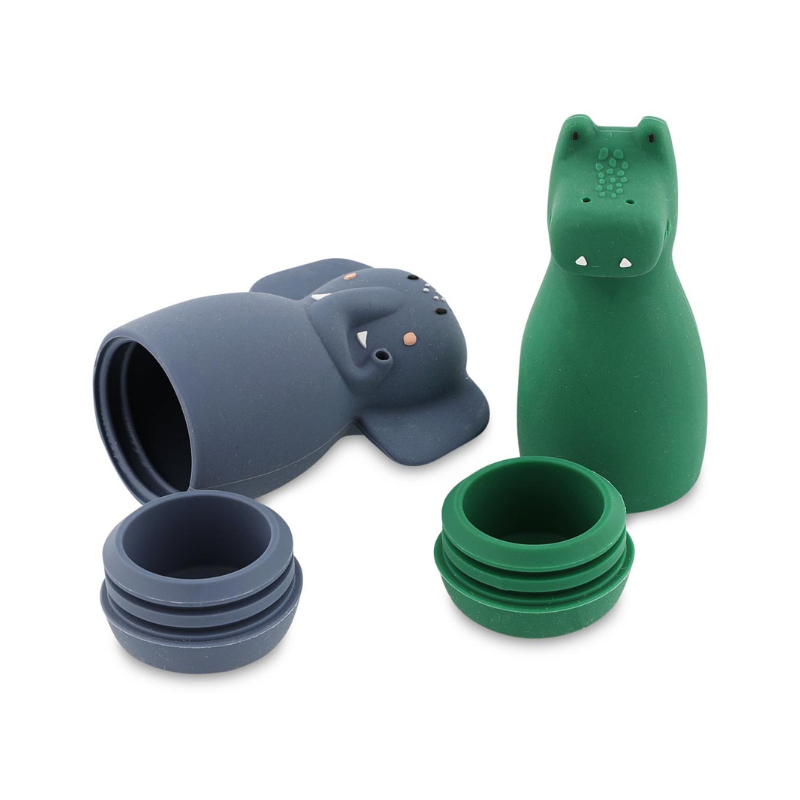 Conjunto de 5 copos empilháveis TRIXIE em silicone 100%. Com furos para jatos de água e copos fechados para encher/despejar. Inclui copo para enxaguar o cabelo. Desenvolve coordenação motora e causa-efeito. Idade 10m+. Seguro, sustentável e adorável.