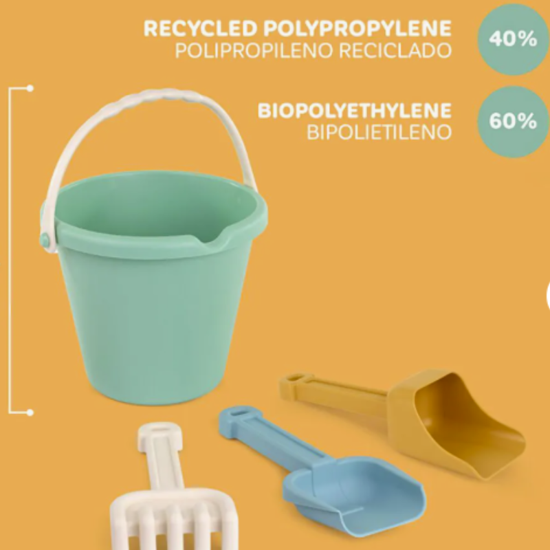 Conjunto de praia ecológico Miniland: balde verde, pá, ancinho e pá de peneirar. Fabricado com 60% biopolietileno e 40% PP reciclado. Cores pastel, resistente para uso coletivo (escolas/creches). Fácil de transportar. Ideal para crianças 18-72 meses. Sustentável e durável.