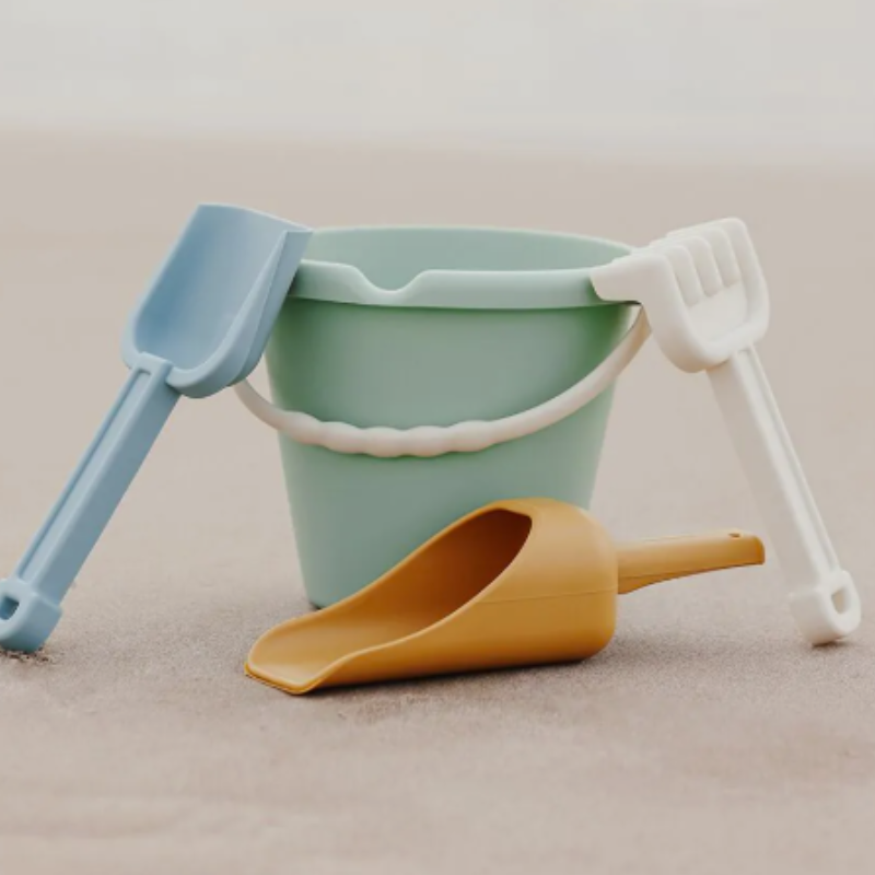 Set de brinquedos de praia Monnëka em tom Sea Green. Inclui balde, pá, ancinho e moldes em silicone macio. Perfeito para brincar na areia com conforto e segurança.
