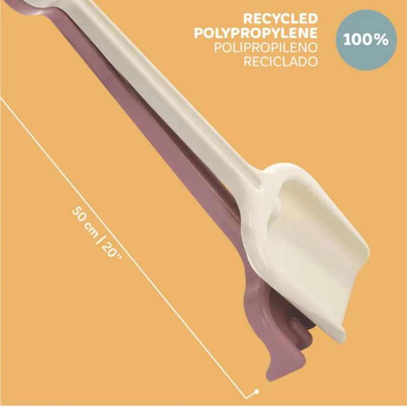 Conjunto de praia Miniland com pá e ancinho gigantes (50cm) em 100% polipropileno reciclado. Estrutura reforçada e cabo extra longo. Resistente para uso coletivo e para brincar na neve. Ecológico e durável.
