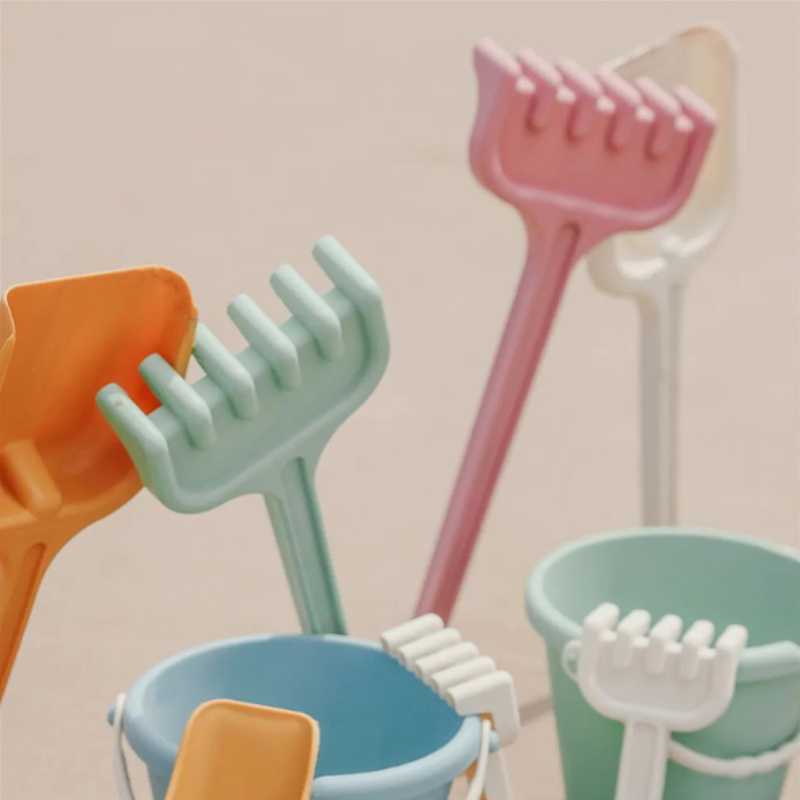 Set de brinquedos de praia Monnëka em tom Sea Green. Inclui balde, pá, ancinho e moldes em silicone macio. Perfeito para brincar na areia com conforto e segurança.