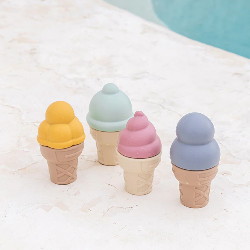 Conjunto de gelados Yummy Ice Cream da Saro em silicone alimentar. 8 peças (4 bolas + 4 cones) que se misturam entre si. Ideal para praia, banheira ou brincadeira em casa. Estimula a imaginação.