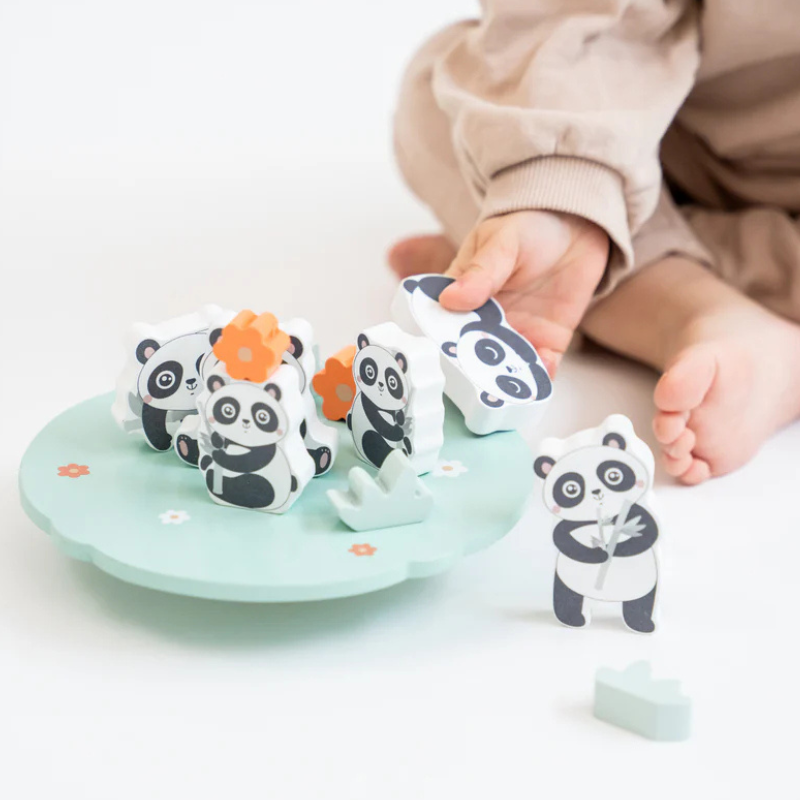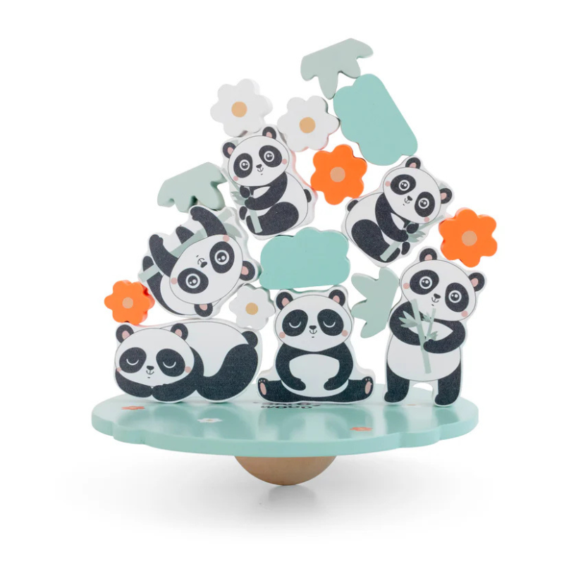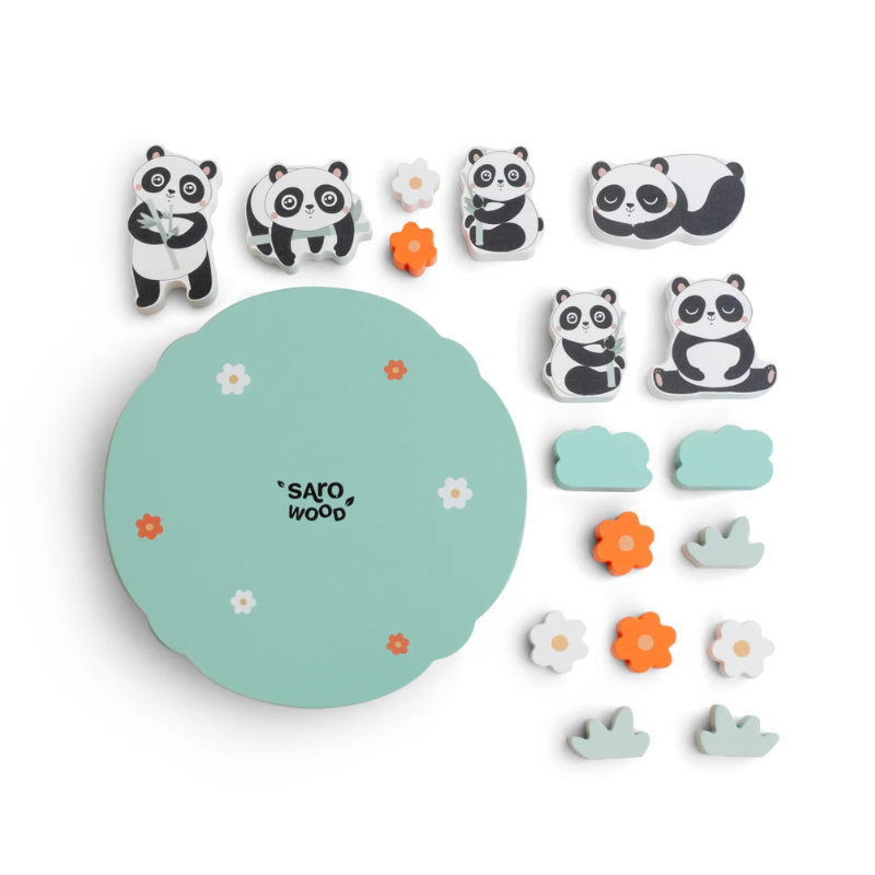 Jogo de equilíbrio Saro Slow Life com tema panda e bambu. Coloca as peças na base instável sem deixar cair. Desenvolve coordenação motora, paciência e criatividade. Madeira certificada FSC. Para toda a família (3-99 anos).