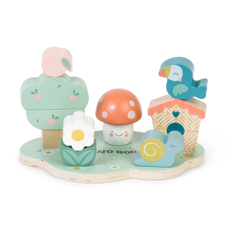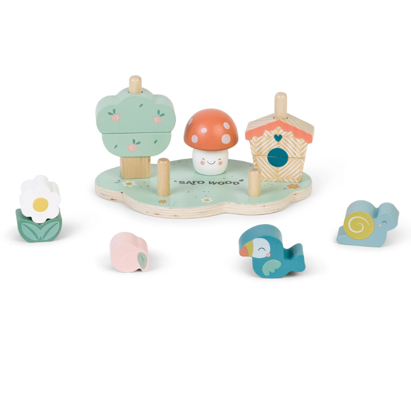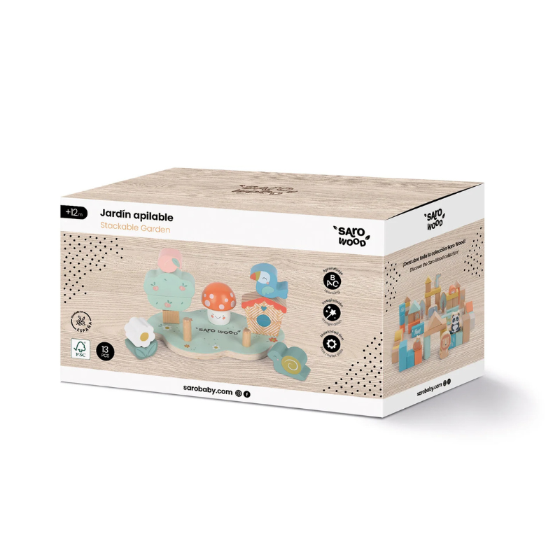 Jardim empilhável Saro, um puzzle de empilhar com tema de jardim. Desenvolve coordenação motora, lógica e criatividade. Peças para criar árvore e cogumelo. Madeira certificada FSC. Conforme normas EN 71, ASTM e CPSIA. +12 Meses.