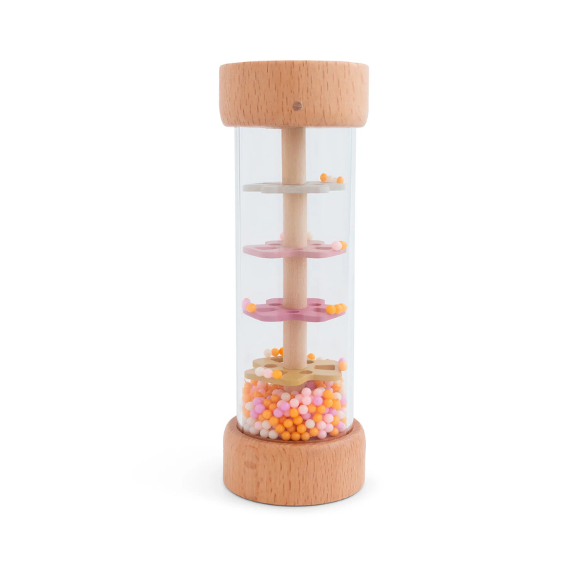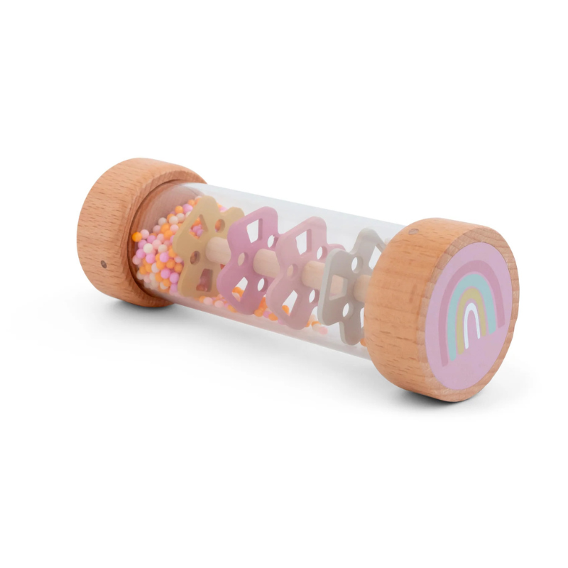 Guizo tipo pau de chuva em madeira FSC que estimula os sentidos do bebé com sons suaves e movimento relaxante. Ao rodar, as contas caem suavemente, produzindo um som relaxante de chuva. Estimula o desenvolvimento visual e auditivo. Recomendado para +3 meses.