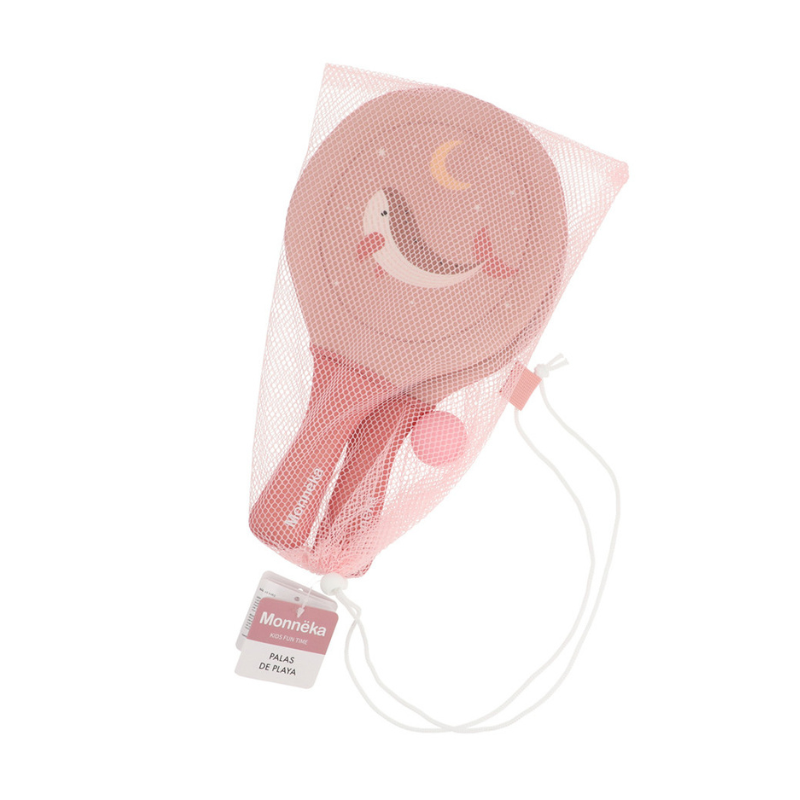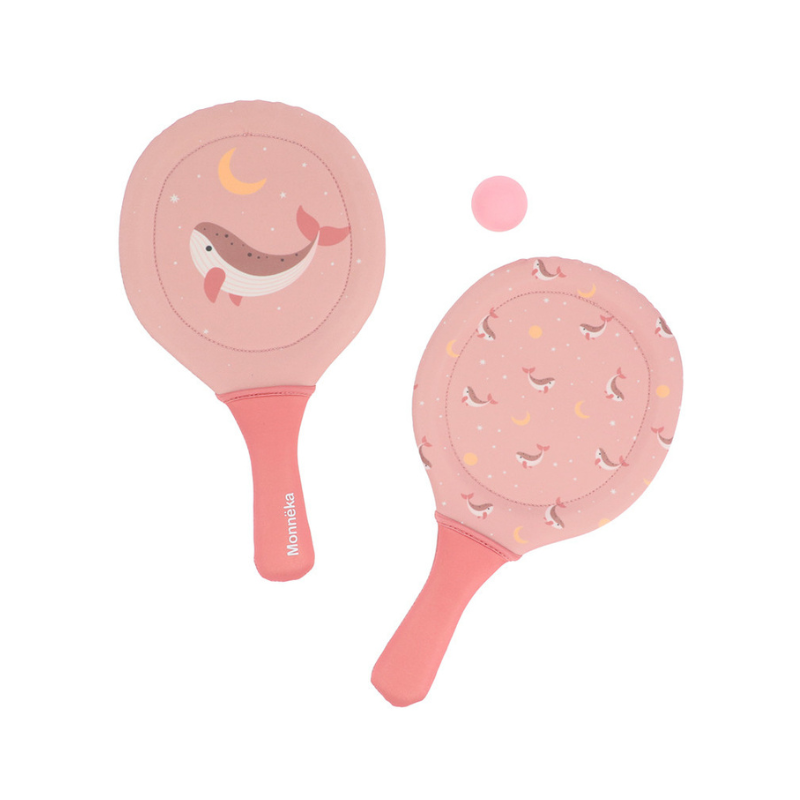 Conjunto de raquetes de neoprene da coleção 2026 Monnëka com 2 raquetes e 1 bola. Leves, duráveis e confortáveis. Perfeitas para praia, piscina ou jardim. Limpeza com pano húmido. A partir dos 3 anos.