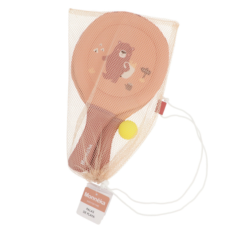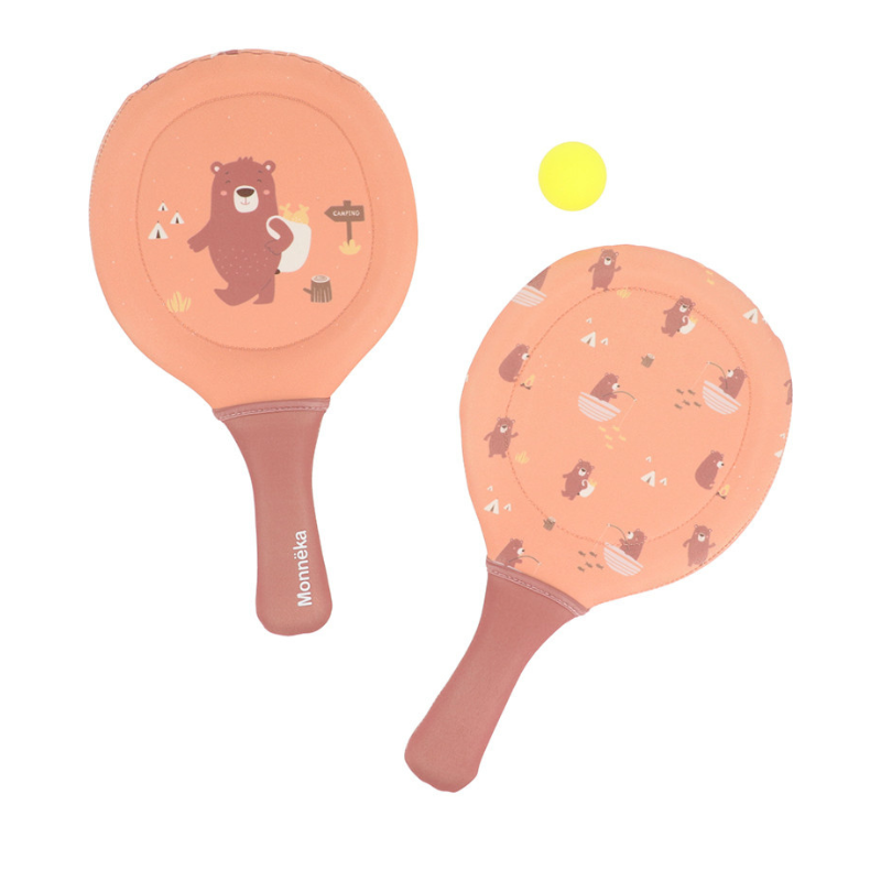 Conjunto de raquetes de neoprene da coleção 2026 Monnëka com 2 raquetes e 1 bola. Leves, duráveis e confortáveis. Perfeitas para praia, piscina ou jardim. Limpeza com pano húmido. A partir dos 3 anos.