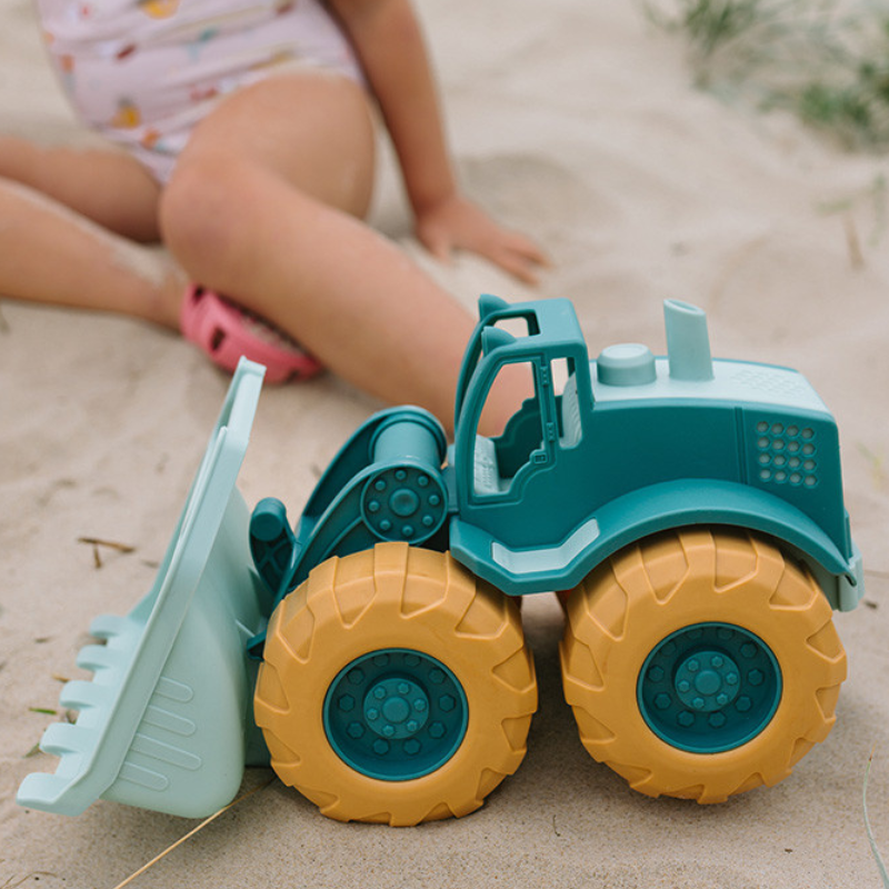 Escavadora Monnëka em plástico flexível ecológico (PPE). 27,5 cm de comprimento, rodas suaves, braço articulado e caçamba basculante. Ideal para areia, jardim ou caixa de areia. A partir dos 6 meses.