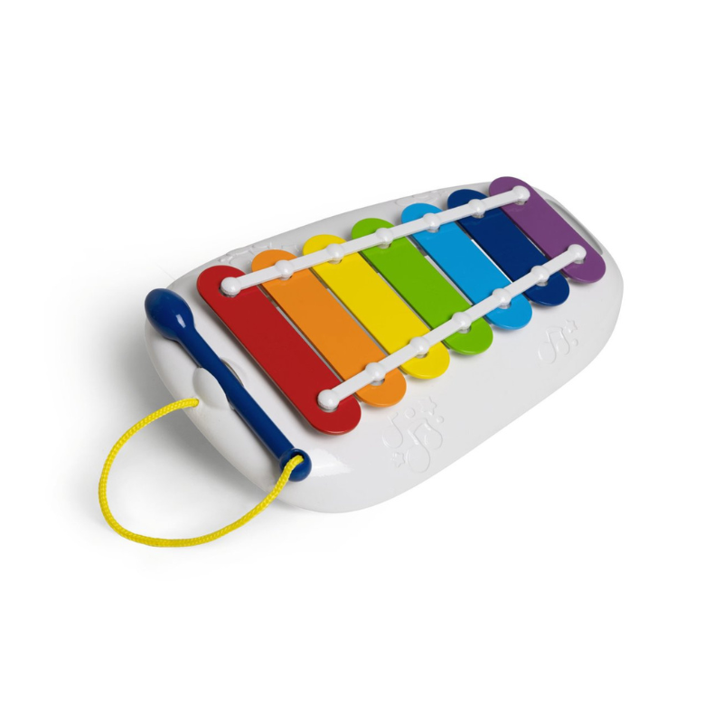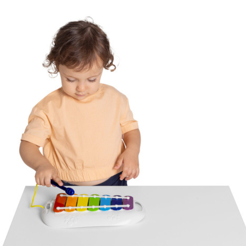 Xilofone colorido com 7 notas de metal, baqueta fácil de segurar e cordão anti-perda. Estimula o ritmo e a criatividade musical dos 1 aos 4 anos.