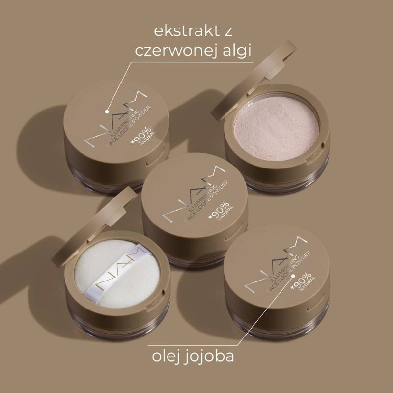 NAM Cosmetics Iluminating Face Loose Powder é um pó iluminador de rosto concebido para definir a maquilhagem, dar luminosidade e potenciar o glow natural da pele.