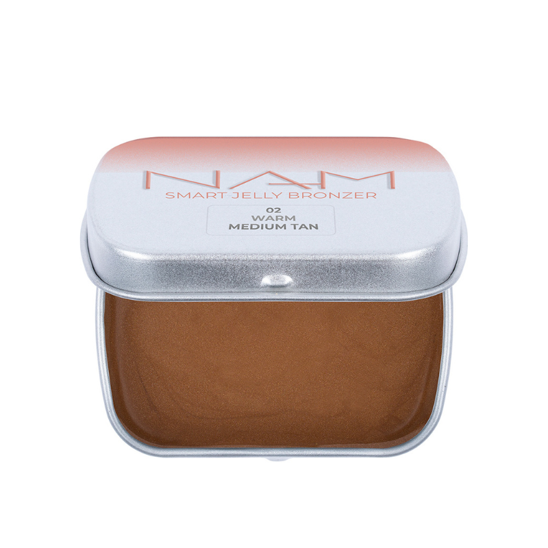 NAM Smart Jelly Bronzer 02 Warm Medium Tan é um bronzer em gel, formulado com óleo de rosa damascena e vitamina E, proporcionando um brilho saudável e hidratante à pele.