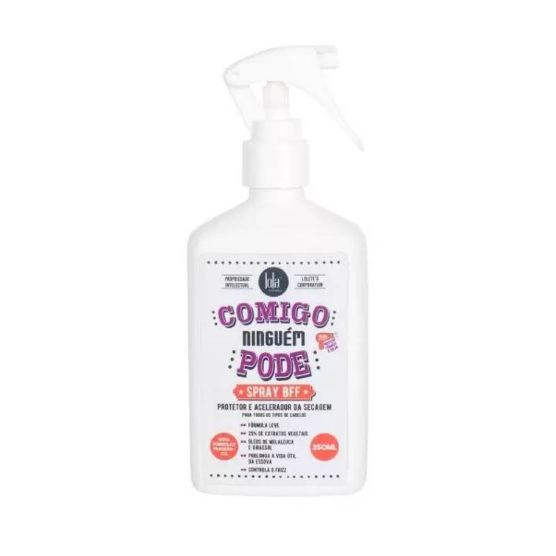 Lola Comigo Ninguém Pode Spray BFF 250ml protege e acelera a secagem de todos os tipos de cabelo.